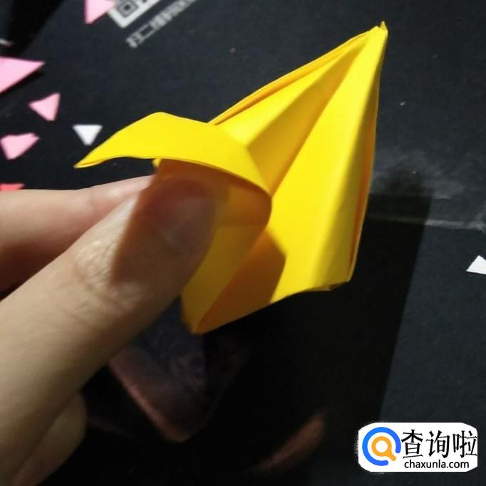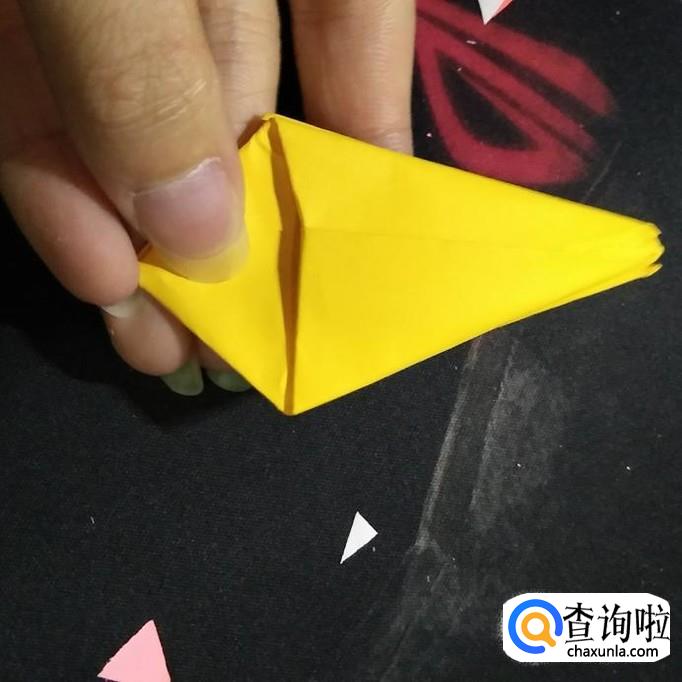 如下图所示,将较长的一条斜边再次与中线重合,另一边做相同操作,然后在斜边1/3的位置处将尖角向上折,如下图2,然后,做下图3所示的处理