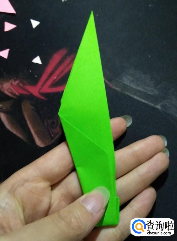 选择一张绿色的纸,角与角对折,如下图一,然后使正方形的一边与斜对线重合,另一边做相同的操作,如下图2,将如下图3所示的方式折叠彩纸