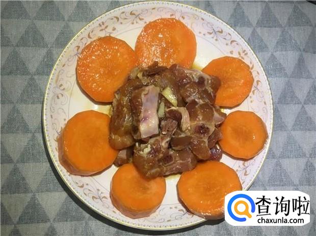然后先把红萝卜摆一圈,再把腌制好的排骨均匀铺在中间。