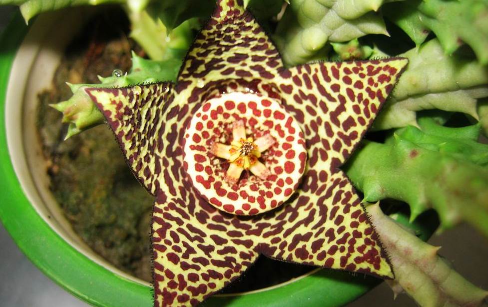 豹皮花的外观和金钱豹的纹路相似,因此得名的。它又被称为臭肉花,开花的时候会散发难闻的味道,会吸引苍蝇,不仅会污染空气,还会滋生细菌。