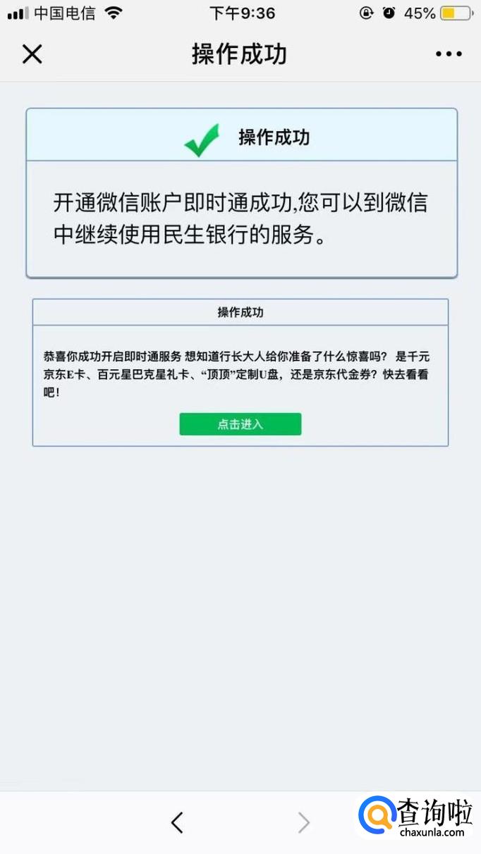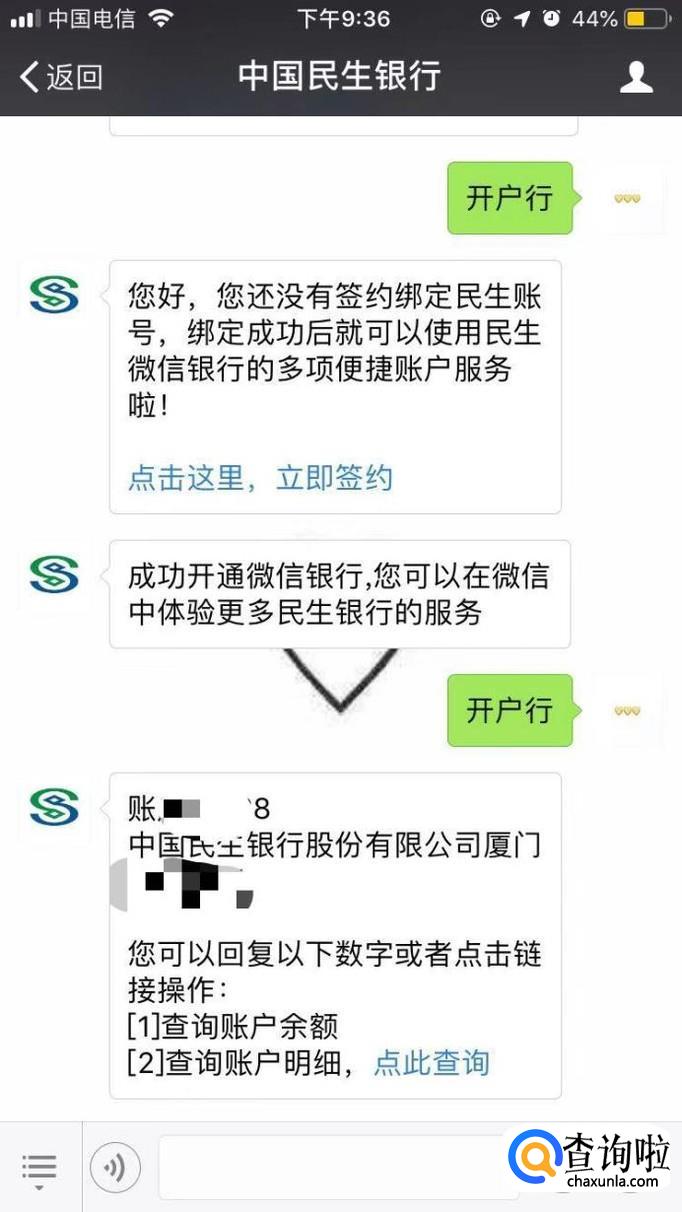 完成绑定后,再次发送“开户行”到公众号。