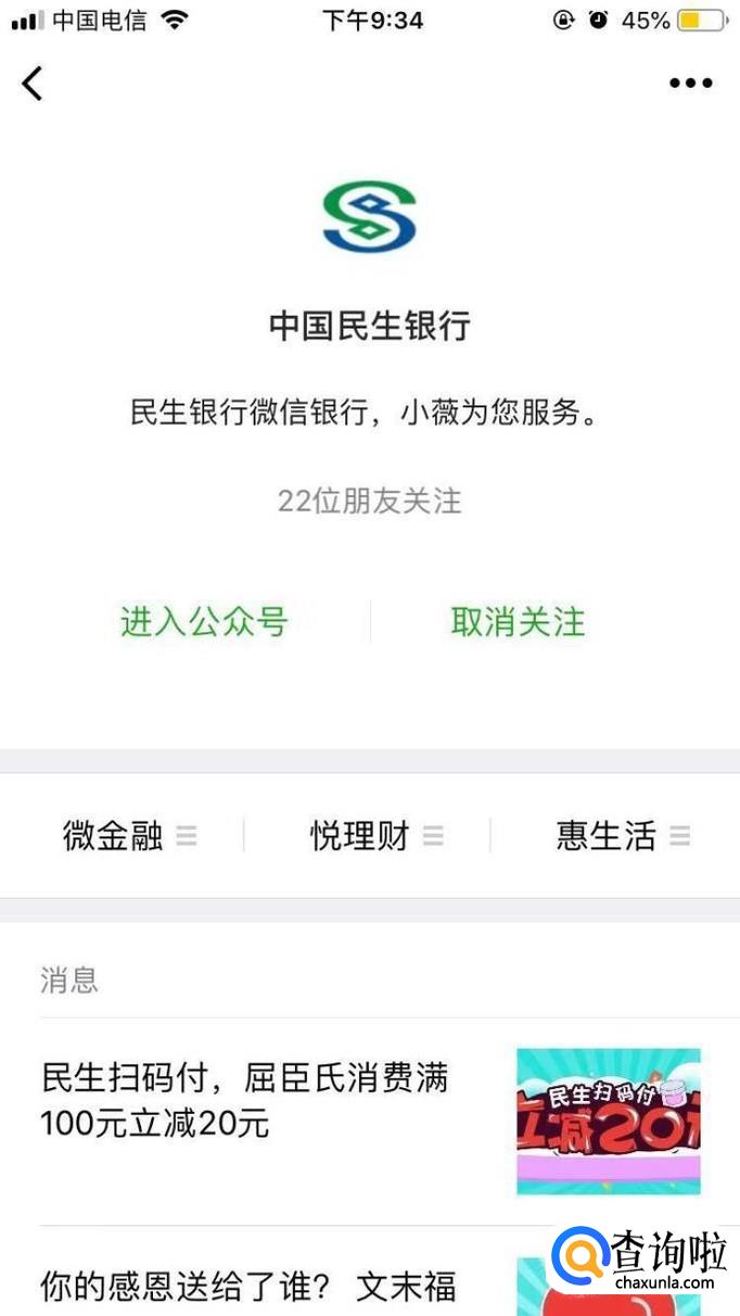 在微信上搜索“中国民生银行”公众号,并关注。