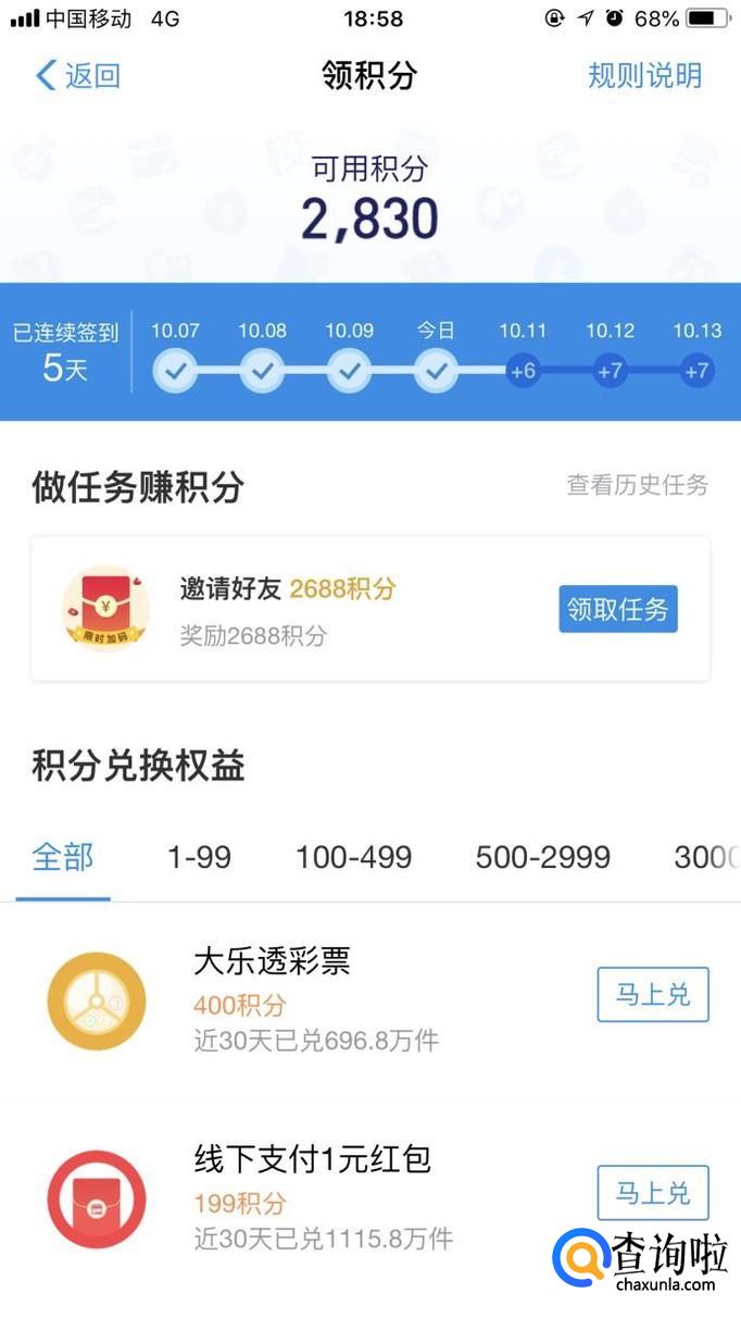 积分兑换。积分可以兑换权益,从10积分到3000积分以上都有对应的权益可以兑换,比如400积分可以兑换大乐透彩票一注,199积分可以兑换支付宝1元的花呗抵扣红包,花呗账单分期免息,还有一些实物奖励等。